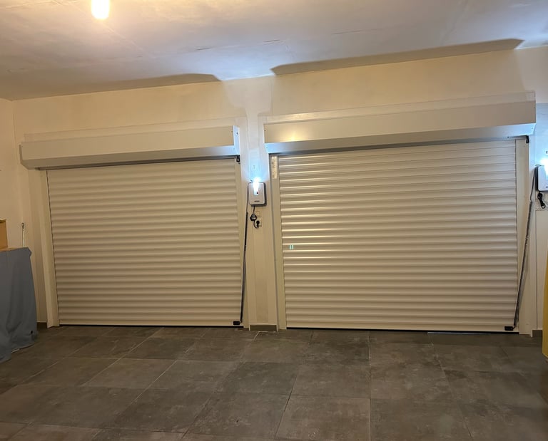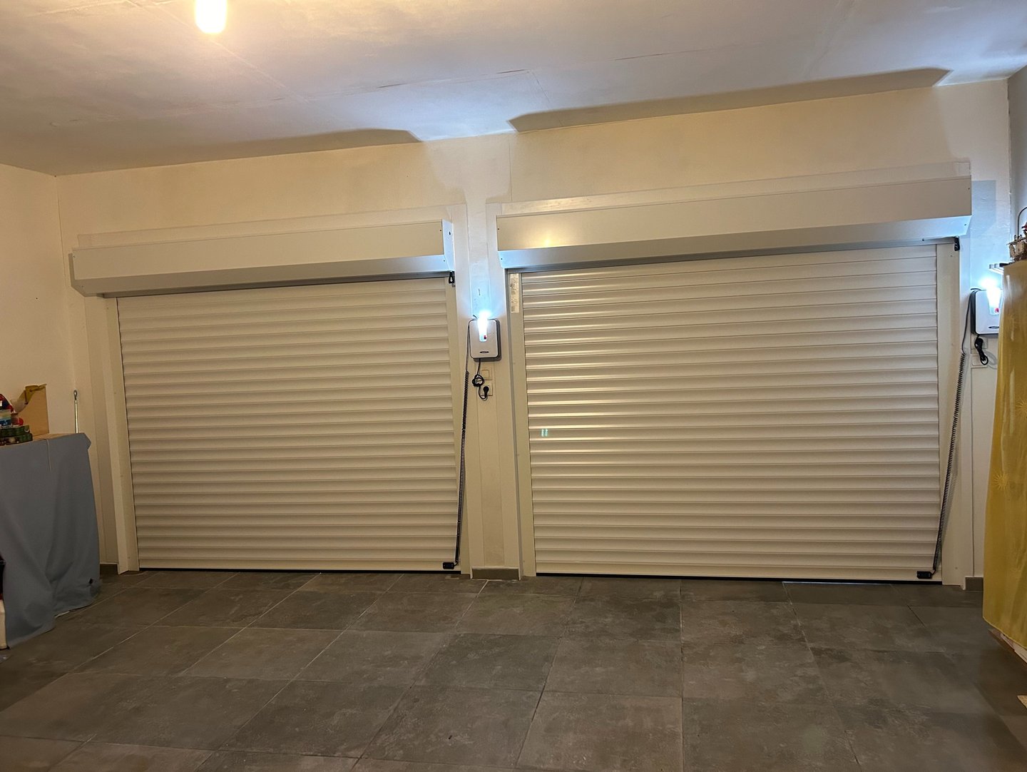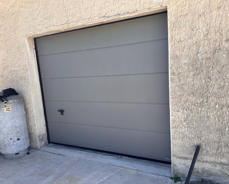 Le tablier se lève, sans s'enrouler, et coulisse le long de rails parallèles fixés au plafond.